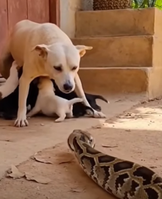 A mother dog was breastfeeding her baby when a snake came in front of her and attacked her
