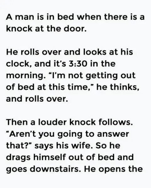 A man is in bed when there is a knock at the door. He rolls over and looks at his clock, and it’s 3:30 in the morning. “I’m not getting out of bed at this time,” he thinks, and rolls over.