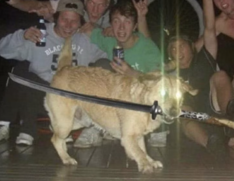 What is happening here? Man’s best friend has somehow got hold of a sword and looks displeased.