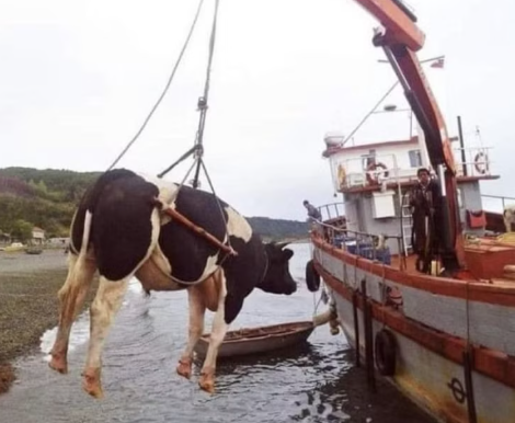 What’s going on here then? A cow being transported by crane into a boat? Does this happen a lot or is this chap starting his own Noah’s ark?