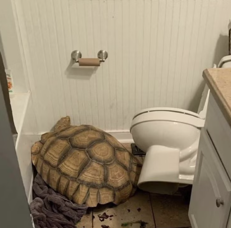 One of the Teenage Ninja Mutant Turtles has escaped from the sewers and is wreaking havoc in this poor soul’s bathroom.